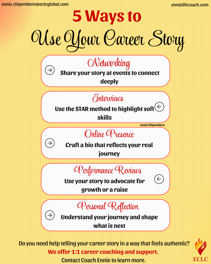 Your career story is more than a summary of your work history—it’s a powerful tool for reflection, connection, and transformation. Whether you are seeking clarity, planning your next move, preparing for opportunities, or inspiring others, your story matters.